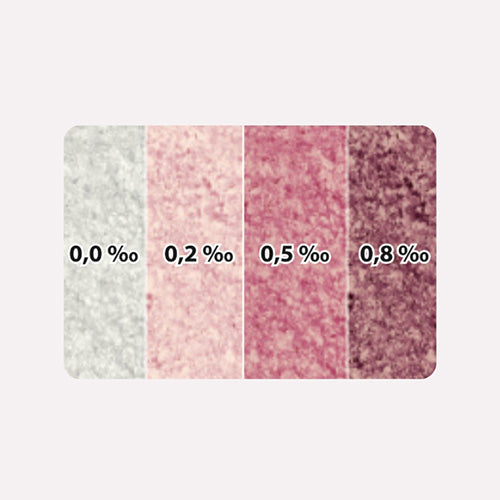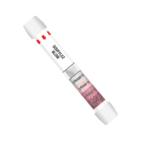 Après avoir pressé les deux extrémités pour percer l’aluminium, il suffit de souffler 2 fois pendant 10 secondes chacune dans l’extrémité où se situent les flèches. Après 4 minutes, comparer la couleur obtenue avec l’échelle de couleurs. Selon votre taux d’alcool, les cristaux seront blancs (0,00), rose pâle (0,02), rose moyen (0,05) ou pourpre (0,08).